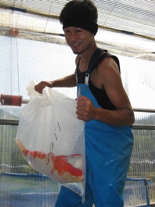 写真撮影を終えた鯉は袋に入れ、水槽車に運びます!(上)