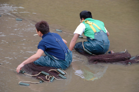 網引き開始です! 水深が浅いので、網が引きにくいです(-_-;)