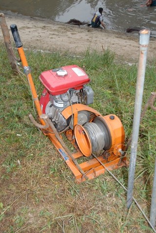 このように運びます!! 「この道のプロ」秋本氏の操縦?により、急傾斜を登り、鯉の入った桶を土手まで運びます!