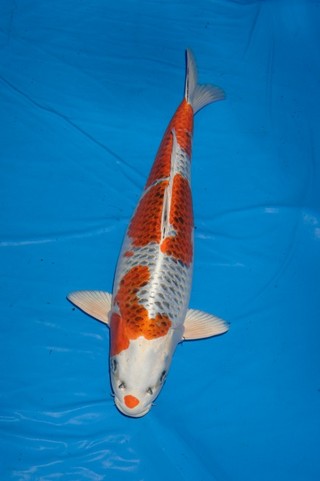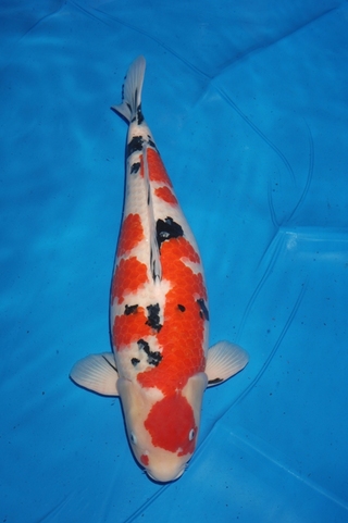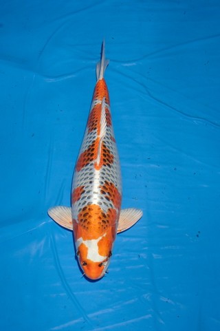 ドイツ三色・・・・明治時代に導入された食用のドイツ鯉に鑑賞用の錦鯉を交配させて改良した品種です。 ドイツ鯉特有の地肌と、鱗並びの華麗な美しさが見所です。