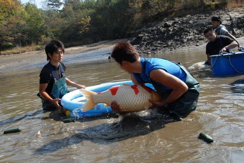 ついに取り上げです! 水を張ったプールに鯉を取り上げていきます!