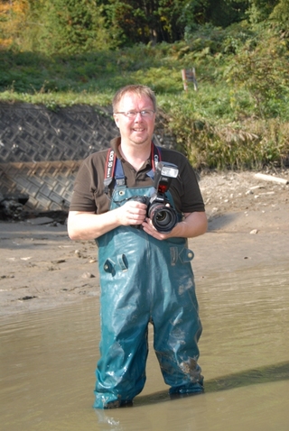 胴付き長靴(胴長)に着替えるカメラー氏! 現場のリアルさが伝わる写真を撮るには自らも泥の中に入らなければなりません!! カメラマンの鏡ですね(^O^)