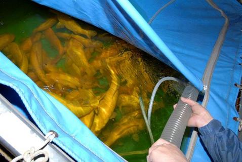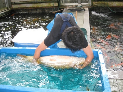 麻酔の入った検寸器に次々と鯉を入れていきます!