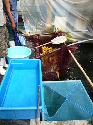 「深夜じゃないじゃん!」っていきなりつっこまれそうな写真ですが、これは出荷の作業ではありません! この日は当才の出荷もあったので(しかも注文が細かい・・・)日中に予め出荷する鯉を選別しておき、しきり網の中に入れておいたのです。