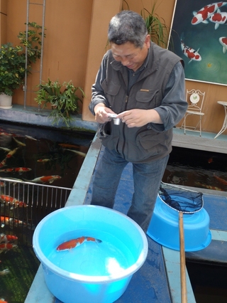 イベント終了後に、売り出し用の鯉を掬い始めた小西 丈治(社長)。